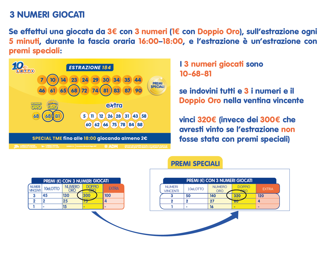 Giocando almeno 2€ durante la fascia oraria dalle 16:00 alle 18:00, puoi partecipare all’estrazione di “premi speciali” (tenendo conto che la prima estrazione con premi speciali può avvenire a partire dalle 16:05).