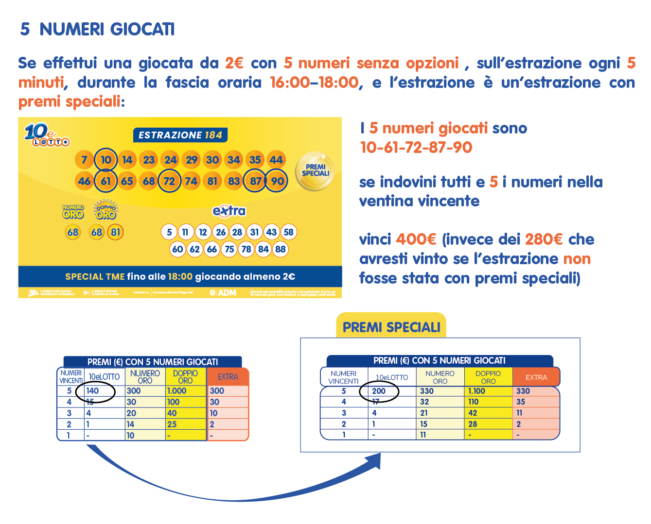 Tutte le giocate al 10eLotto per l’estrazione ogni 5 minuti di 2€ o importo maggiore (per singola giocata e per singola estrazione) emesse per un’estrazione che avviene tra le 16:00 e le 18:00, possono partecipare alle estrazioni con PREMI SPECIALI.