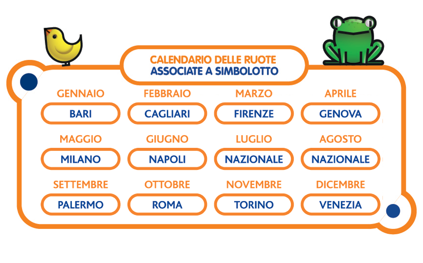 L’estrazione Simbolotto è associata alle Ruote del Gioco del Lotto, Ruota Nazionale compresa. Ogni mese, la Ruota in promozione sulla quale è possibile puntare per partecipare al gioco del Simbolotto cambia, secondo un calendario predefinito. Il calendario indica, per ciascuno dei 12 mesi dell’anno, la Ruota Simbolotto associata: