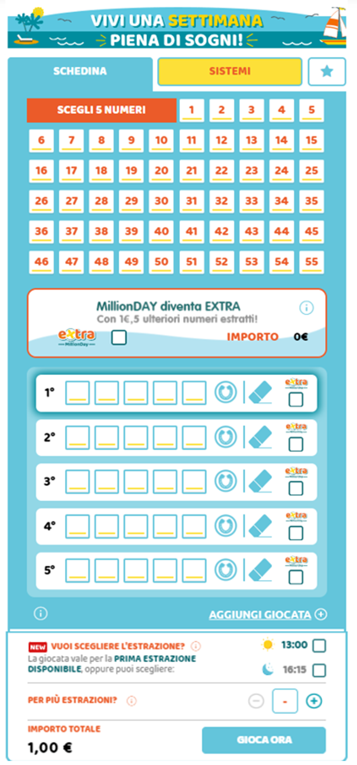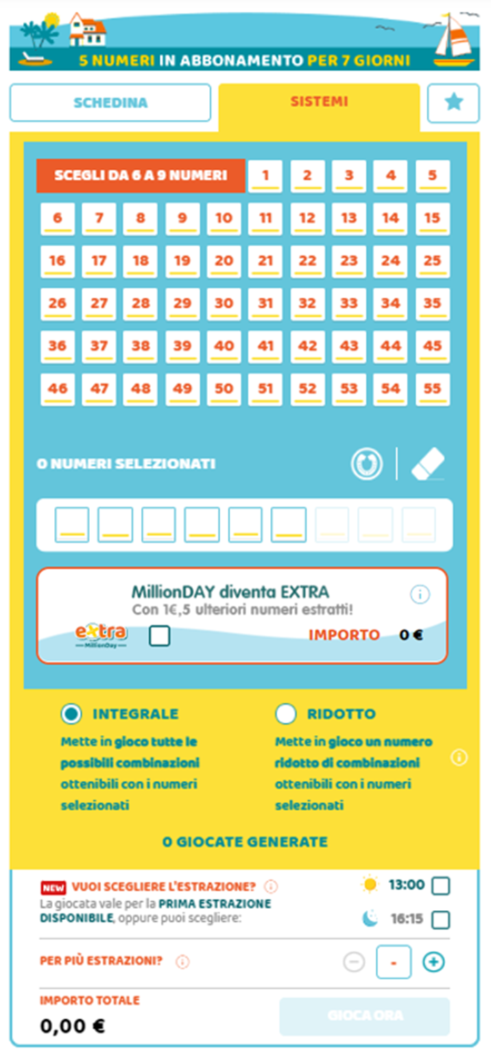 - la giocata Sistemistica permette la compilazione di una giocata in cui sarà possibile selezionare da 6 a 9 numeri tra 1 e 55 compreso e selezionare il tipo di sistema tra Integrale e Ridotto e la possibilità di aggiungere l’opzione EXTRA al costo di 1€ per ogni giocata del Sistema.