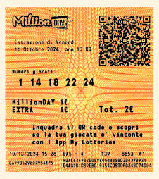 Lo scontrino del MillionDAY, rilasciato dal ricevitore dopo ogni giocata, riepiloga tutte le informazioni relative alla giocata stessa.